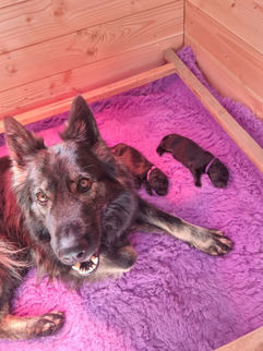 Seven a eu une mise-bas difficile, qui s'est malheureusement terminée en césarienne, et le dernier chiot n'a pas pu être sauvé. Ce petit chiot veille sur ses sœurs⭐.
